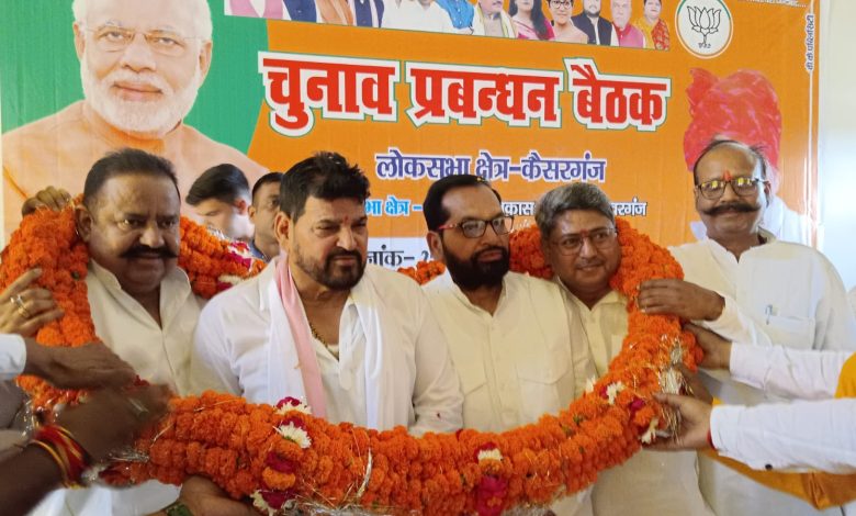 बहराइच : राजकुमार: लोकसभा सामान्य निर्वाचन को लेकर गुरुवार को रसिक बिहारी महाविद्यालय विशेश्वरगंज में भाजपा चुनाव प्रबंधन की बैठक आयोजित की गई।ब्लाक प्रमुख प्रतिनिधि राकेश पाण्डेय द्वारा बैठक में क्षेत्र के सभी ग्राम प्रधान व क्षेत्र पंचायत सदस्यों को आमंत्रित किया गया। बैठक में मुख्य अतिथि व संभावित भाजपा प्रत्याशी कैसरगंज बृजभूषण शरण सिंह उपस्थित रहे। उपस्थित लोगों को संबोधित करते हुए मुख्य अतिथि ने बताया कि भाजपा ने अपनी पहली सूची दो मार्च को घोषित की इस प्रकार हम लोग 53 दिन पीछे हो गए है। कम समय में अधिक कार्य करना होगा। बूथ अध्यक्ष व पन्ना प्रमुख को सक्रिय रहने की जरूरत है।उन्होंने बताया कि टिकट में हो रही देरी ने कैसरगंज को लोकसभा की हॉट सीट बना दिया है।बैठक में विधायक पयागपुर सुभाष त्रिपाठी,अरुण वीर सिंह,विधायक प्रतिनिधि निशंक त्रिपाठी,पूर्व ब्लाक प्रमुख सच्चिदानंद पाठक,मंडल अध्यक्ष राज कुमार शुक्ल,दीपक सत्या,जिला मंत्री हेमा निगम,उमाशंकर तिवारी पांडेय,संजीव तिवारी, मोहनचंद पांडेय,अरविंद मिश्र सहित अधिक संख्या में लोग उपस्थित रहे।