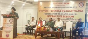 कार्यक्रम में मुख्य अतिथि अश्वनी कुमार गुप्ता क्षेत्रीय आयुक्त भविष्य निधि व उदय बक्शी अपर केन्द्रीय भविष्य निधि आयुक्त उ0प्र0, उपस्थित थे। अश्वनी कुमार गुप्ता क्षेत्रीय आयुक्त भविष्य निधि ने कार्यक्रम को संबोधित करते हुए कहा कि श्रम एवं रोजगार मंत्रालय ने रोजगार से जुड़ी प्रोत्साहन योजना भारत सरकार ने 01.07.2025 को सभी क्षेत्रों में रोजगार सृजन को बढ़ावा देने, रोजगार क्षमता बढ़ाने और सामाजिक सुरक्षा को बढ़ावा देने के लिए, विनिर्माण क्षेत्र पर विशेष ध्यान देते हुए, रोजगार से जुड़ी प्रधानमंत्री विकसित भारत रोजगार योजना को मंजूरी दी है। ₹99,446 करोड़ के परिव्यय के साथ प्रधानमंत्री विकसित भारत रोजगार योजना योजना का उद्देश्य 2 वर्षों की अवधि में देश में 3.5 करोड़ से अधिक रोजगार सृजन को प्रोत्साहित करना है।